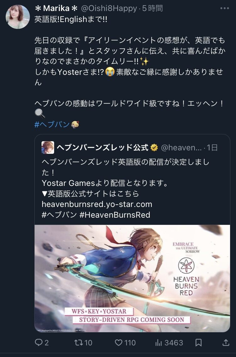 ヘブ声優のTwitterアカウントでフォローしてるのがいのりんとアイリーンの中の人やからな☺